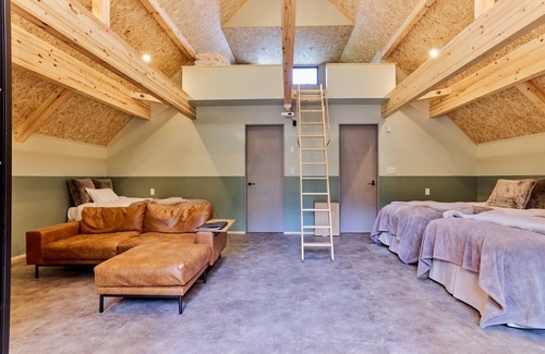 Chec / A cottage equipped with a barrel sauna jacuzzi BBQ grill and screen theater Up to six Simmons beds can be accommodated and two sets of futons can be provided in the loft